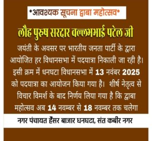 संतकबीरनगर – जिले के दक्षिणांचल क्षेत्र की सांस्कृतिक विरासत को राष्ट्रीय फलक पर ले जाने की मुहिम के साथ गत वर्ष से शुरू हुआ द्वाबा महोत्सव का आयोजन इस साल भी होगा। महोत्सव को लेकर जहां तैयारियां मुक्कमल थी वहीं इसके तारीख का भी ऐलान कर दिया गया था। इस महोत्सव की शुरुवात आगामी 13 नवंबर को होना तय था लेकिन इसी बीच महोत्सव के आयोजक चेयरमैन प्रतिनिध नीलमणि ने नीयत तिथि के एक दिन बाद यानी 14 नवंबर से इसके आगाज होने की घोषणा करते हुए आमजन को इसकी जानकारी अपने ऑफिशियल पेज से दी है।