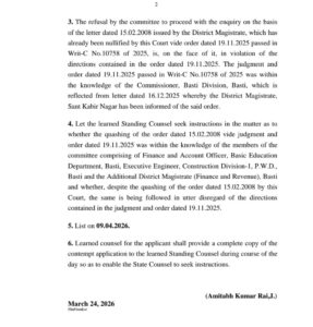 आवेदक के अधिवक्ता मनोज कुमार गुप्ता और राजेश कुमार शुक्ला ने न्यायालय को बताया कि हाईकोर्ट द्वारा उक्त प्रतिबंधात्मक आदेश को रद्द किए जाने के बावजूद, बस्ती मंडल के अधिकारियों ने लोकायुक्त के समक्ष लंबित एक शिकायत पर जांच आगे बढ़ाने से मना कर दिया। वित्त एवं लेखा अधिकारी (बेसिक शिक्षा), अधिशासी अभियंता (पी.डब्ल्यू.डी.) और अपर जिला मजिस्ट्रेट (वित्त एवं राजस्व) की समिति ने 24 दिसंबर 2025 की अपनी रिपोर्ट में उसी निरस्त हो चुके 2008 के आदेश का हवाला दिया है। न्यायालय ने तल्ख टिप्पणी करते हुए कहा कि रिकॉर्ड से स्पष्ट है कि कमिश्नर, बस्ती को हाईकोर्ट के आदेश की जानकारी थी, फिर भी निर्देशों की अनदेखी की गई। अदालत ने अब विद्वान स्थायी अधिवक्ता को निर्देश प्राप्त करने को कहा है कि क्या समिति के सदस्यों को आदेश रद्द होने की जानकारी थी और इसके बावजूद उन्होंने जानबूझकर पुराने आदेश का पालन क्यों किया। मामले की अगली सुनवाई 9 अप्रैल, 2026 को तय की गई है।